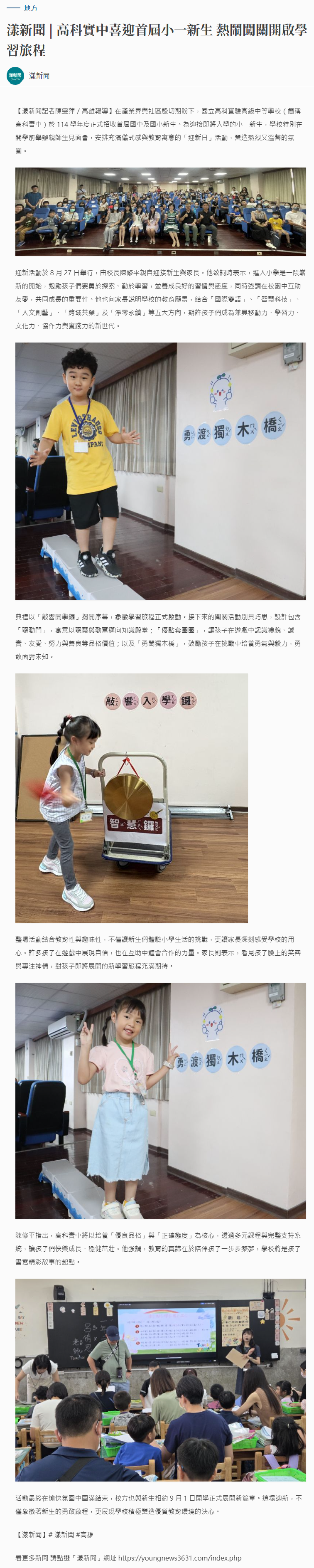 NEW1140831_高科實中喜迎首屆小一新生 熱鬧闖關開啟學習旅程_漾新聞Post author:網站管理員Post published:2025-09-01Post category:媒體報導 / 媒體報導暨榮譽榜 / 學務處公告 / 教務處公告 / 最新公告 / 總務處公告 / 輔導室公告🌟【漾新聞】 新聞連結 https://news.owlting.com/articles/1117573 Post Views: 385