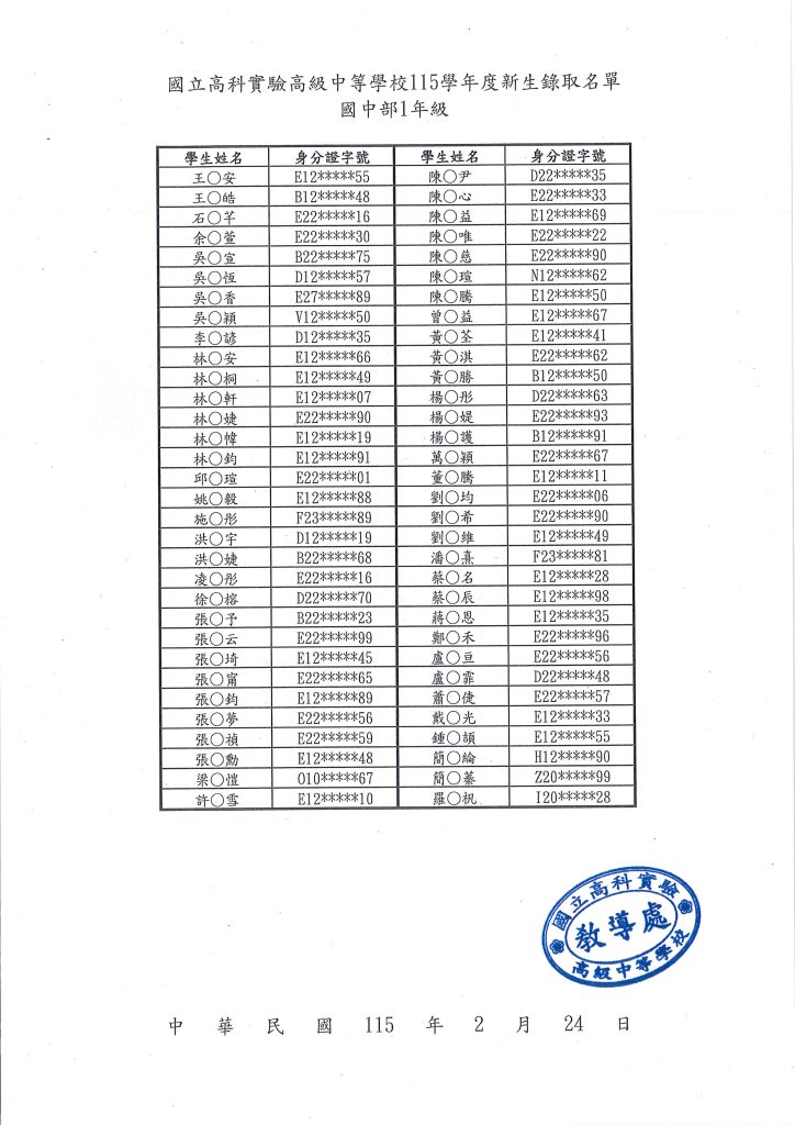 HOT【招生快訊】115學年度「國中部新生錄取名單」及「線上報到」Post author:教務組Post published:2026-02-24Post category:國中部 / 教務處公告 / 最新公告本校115學年度「國中部新生錄取名單」、「國中部新生線上報到連結」、「放棄錄取聲明書」公告如下。請務必於 2月25日(三)上午9點 ~ 2月26日下午4點 期間,完成線上報到,逾期視同放棄。🎯 國中部新生線上報到 (請完成以下兩份表單)1.➡️ 線上報到網頁 ⬅️ 2.➡️ 國中部新生調查表 ⬅️ 🚩國中部115學年度放棄錄取聲明書下載 Post Views: 2,088