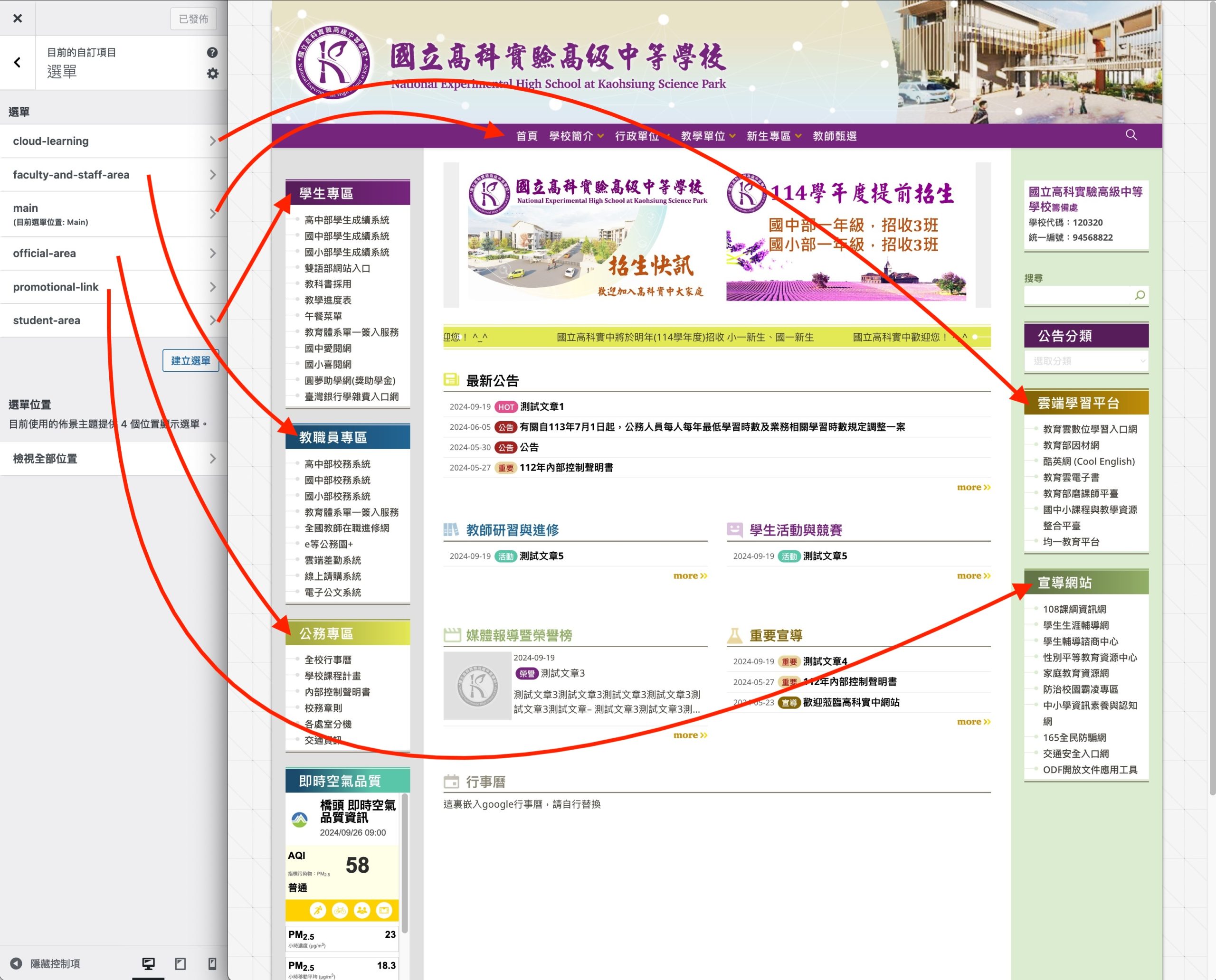 - 改至正式網址時,所有用到「https://web.hs.edu.tw/nehskh/」的連結均須修改,如:自訂選單連結、按鍵連結等。