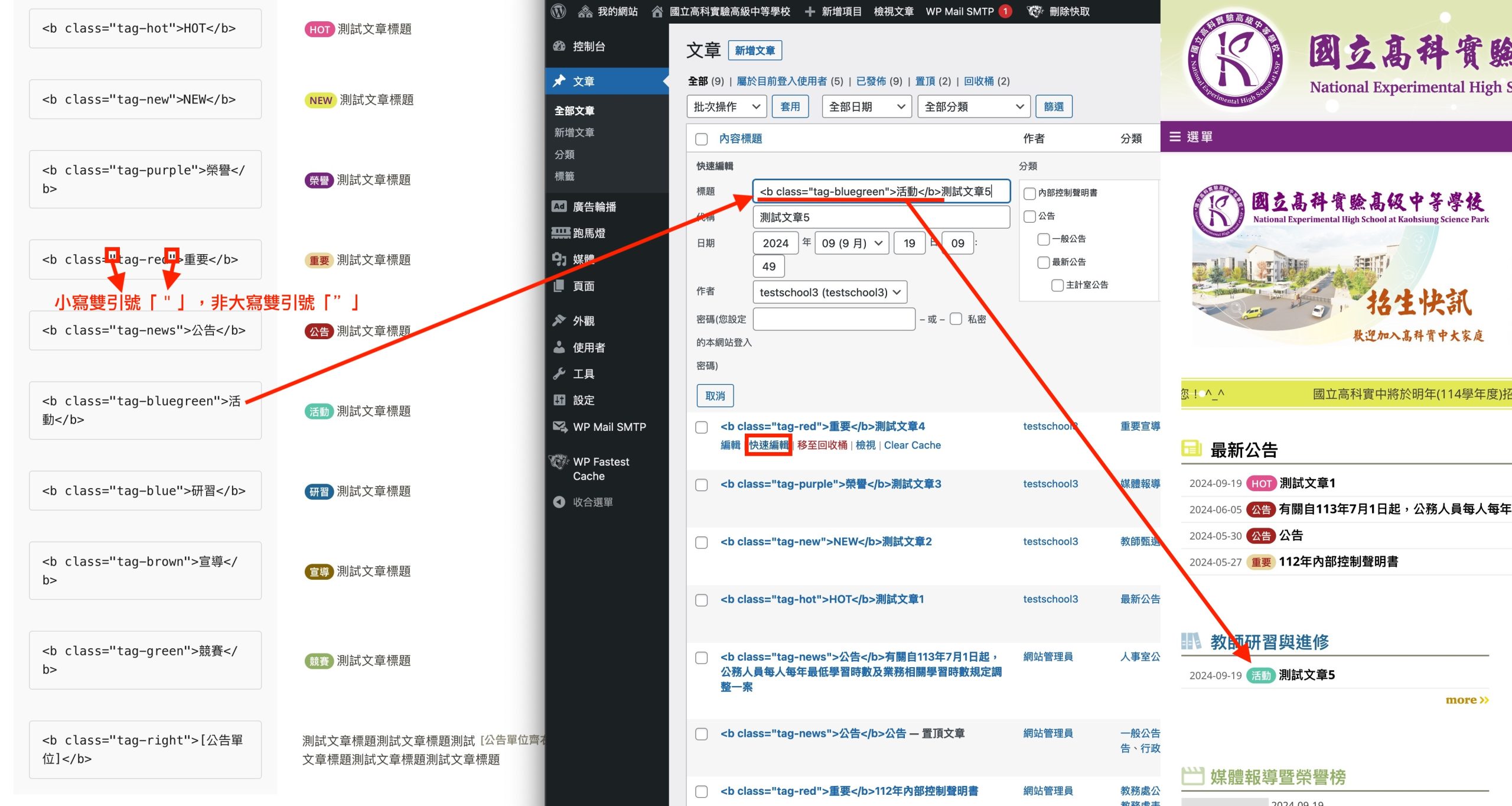 列表式最新文章標題手動標籤:文章列表清單點擊「快速編輯」,於內容標題前方加入適合的前綴標示 (先複製左側語法貼再貼至標題),因資安問題若在文章編輯區以謄打輸入方式的小寫雙引號可能會被程式置換,所以儲存後請檢查其是否正確,若被替換請自行重打為小寫雙引號!!樣式語法與對應樣式如下: