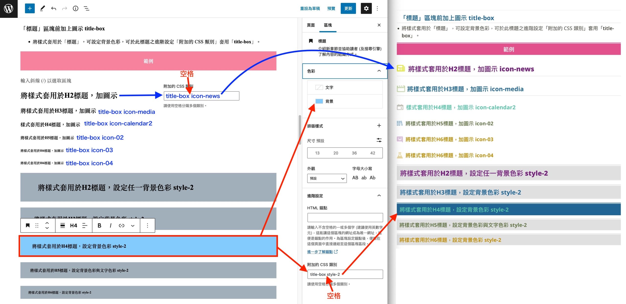 - 將樣式套用於「標題」,可設定背景色彩,可於此標題之進階設定「附加的 CSS 類別」套用「title-box」。