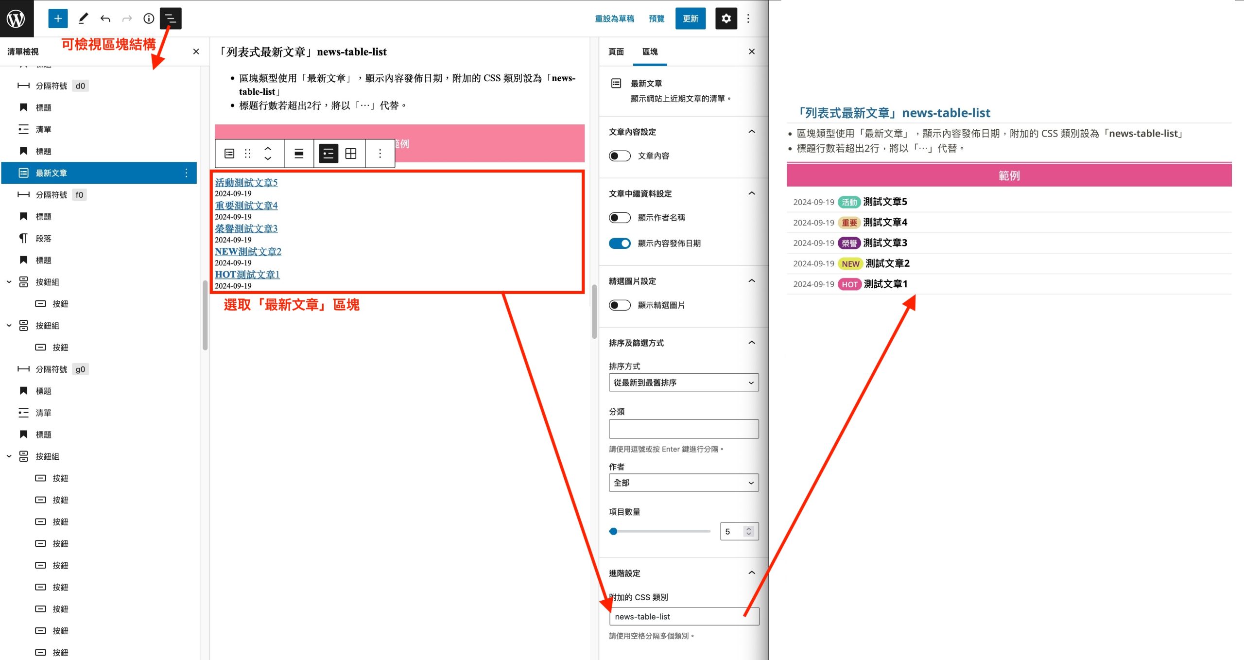 - 區塊類型使用「最新文章」,顯示內容發佈日期,附加的 CSS 類別設為「news-table-list」