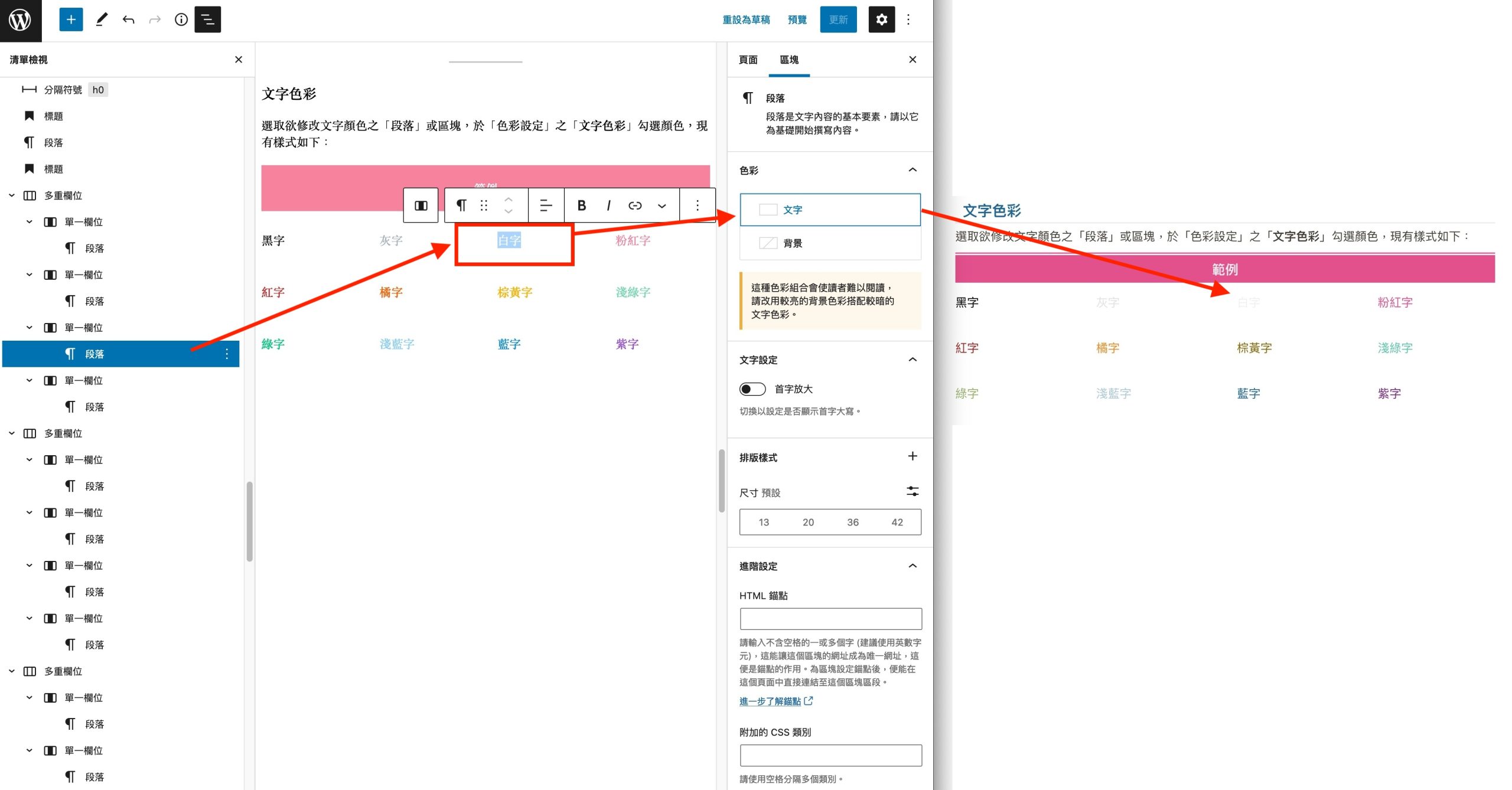 選取欲修改文字顏色之「段落」或區塊,於「色彩設定」之「文字色彩」勾選顏色,現有樣式如下: