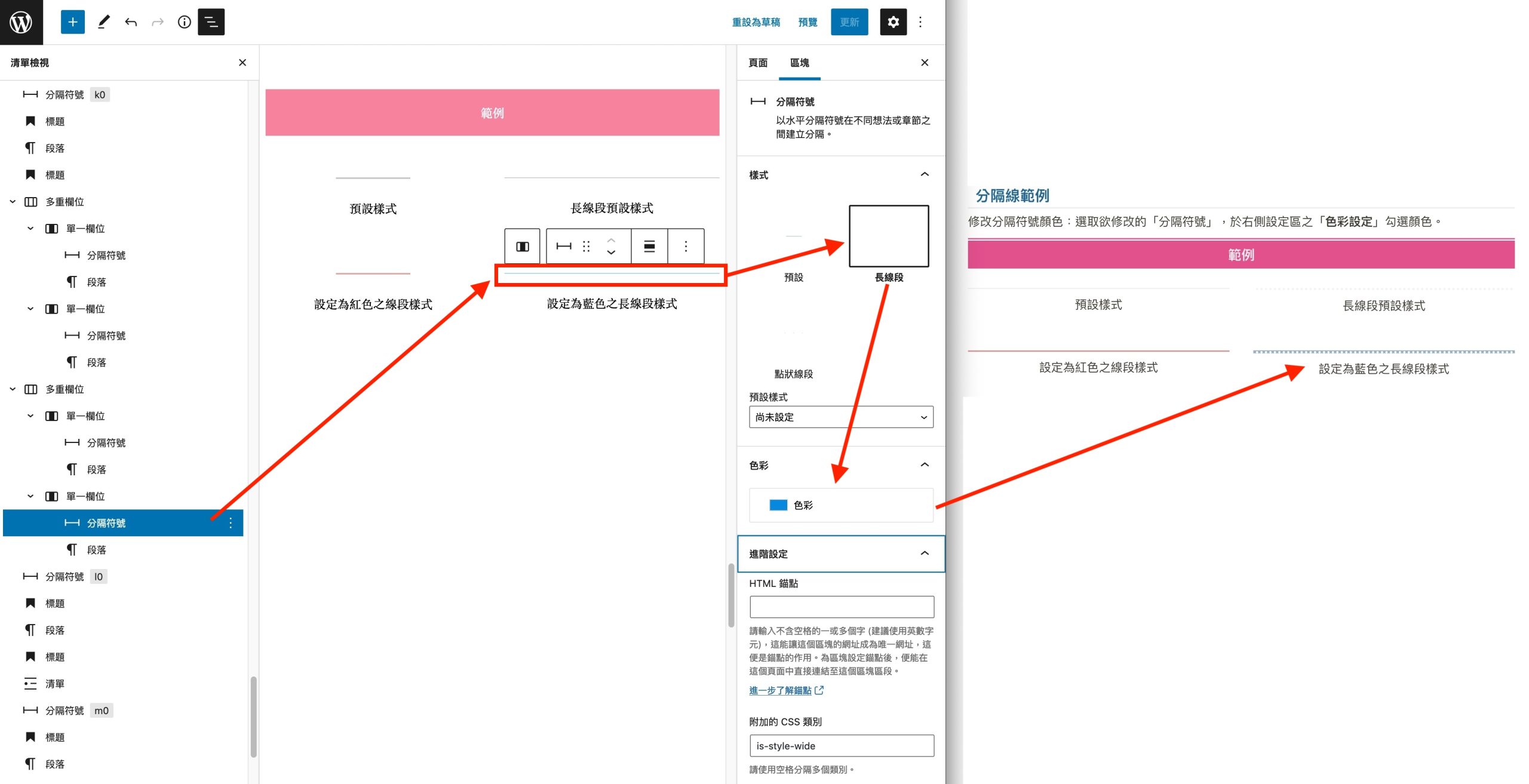 修改分隔符號顏色:選取欲修改的「分隔符號」,於右側設定區之「色彩設定」勾選顏色。