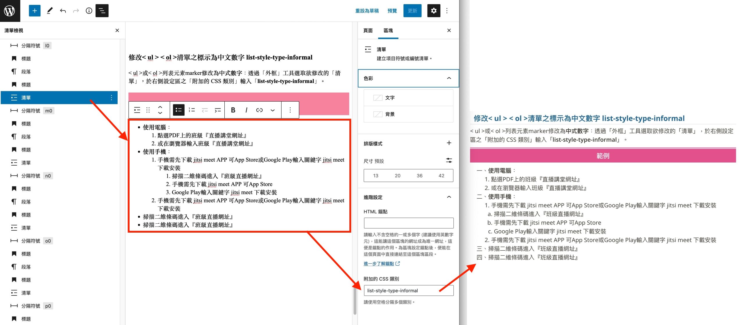 < ul >或< ol >列表元素marker修改為中式數字:透過「外框」工具選取欲修改的「清單」,於右側設定區之「附加的 CSS 類別」輸入「list-style-type-informal」。