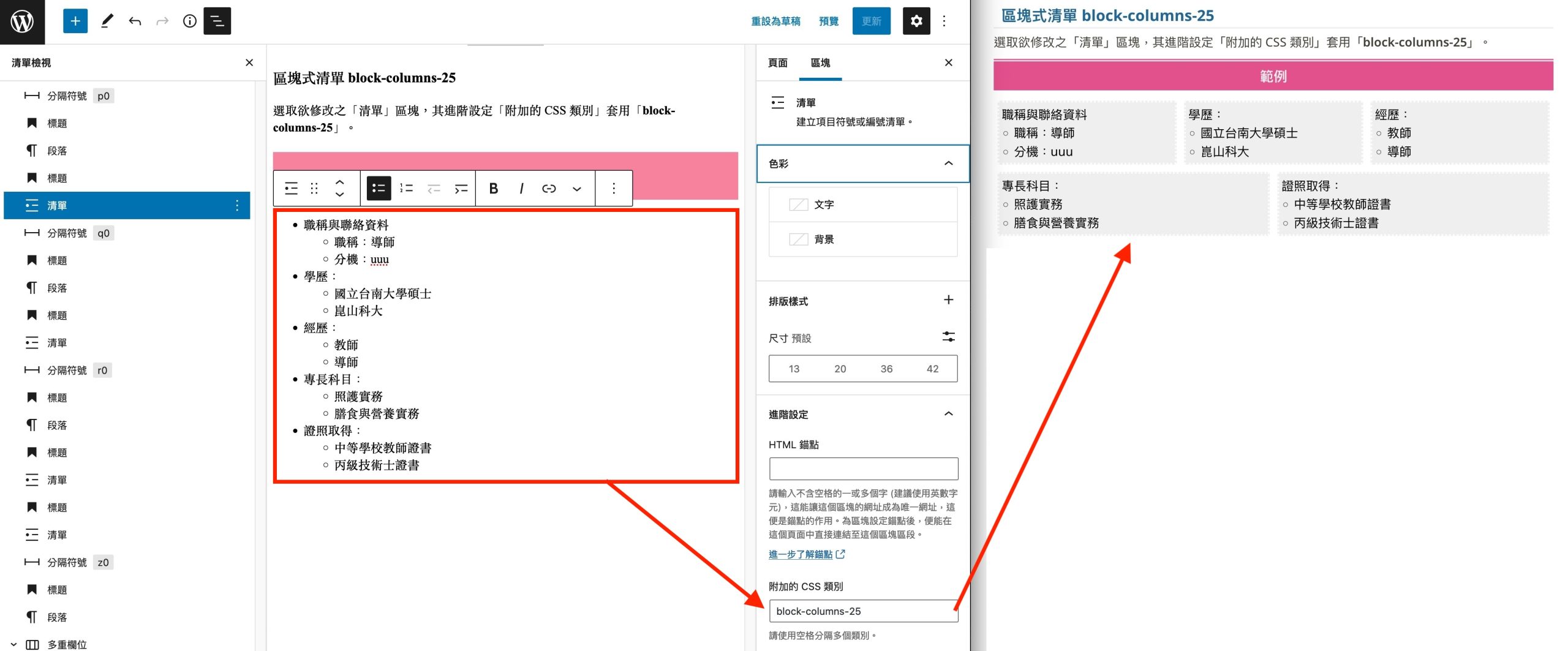 選取欲修改之「清單」區塊,其進階設定「附加的 CSS 類別」套用「block-columns-25」。